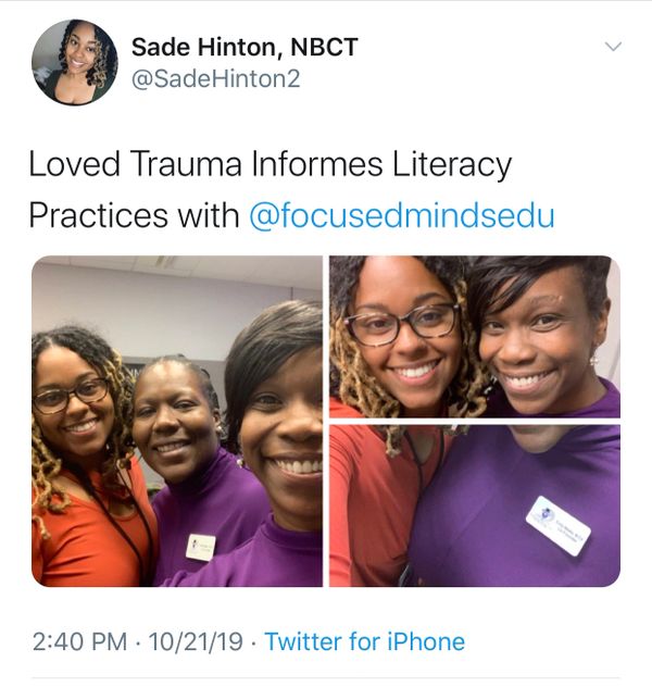 "I was impressed with the specific strategies tying literacy instruction (reading, writing, speaking) with trauma. These teachers taught me so much in the limited time that they had. I thought their approaches were innovative and engaging."